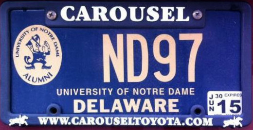 Notes: University of Notre Dame was the first college to have a license plate in Delaware. Delaware State University was second and University of Delaware was third (February 1996). Registrants are able to choose their plate number with most special organization types. For example, someone may choose the four-digit year in which they graduated for a school plate type, but that does not mean that over a thousand (or more) of that plate type have been issued.