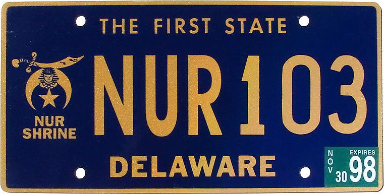Notes: Waldale Manufacturing took over Delaware plate production in July 2002. It is unknown when this particular plate type began to appear on Waldale plates. Registrants are able to choose their plate number with most special organization types. For example, someone may choose the four-digit year in which they graduated for a school plate type, but that does not mean that over a thousand (or more) of that plate type have been issued.