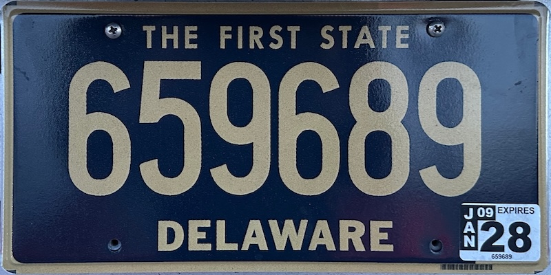 Notes: "THE FIRST STATE" slogan added for the first time. Number 1 reserved for Governor. Number 2 reserved for Lt. Governor. Number 3 reserved for Secretary of State.