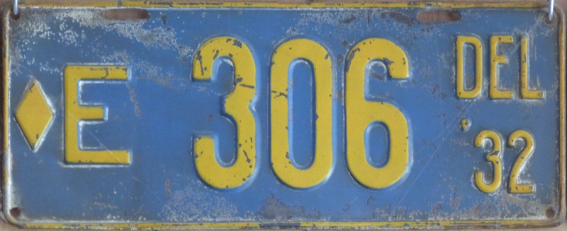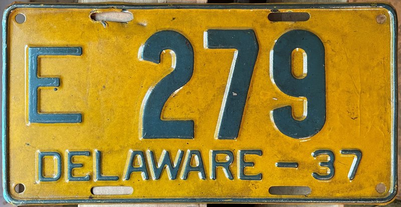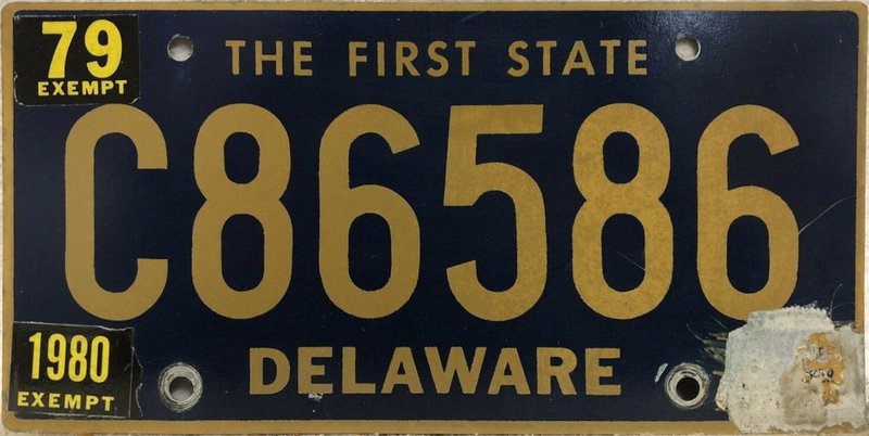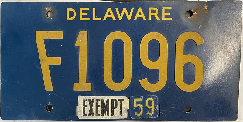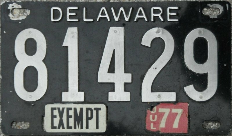 Notes: It is believed that reserved number blocks were no longer used starting with the July 1941 base. Plates exempt from inspection used an "EXEMPT" tab in place of the month-day tab. Gold border and sticker box added. Sticker box added "PLACE STICKER HERE" circa 1971. Starting point of #262000 per newspaper article. Some plates in the low #200000s had folio-style "THE FIRST STATE". Riveted numbers are generally replacement plates made at DMV while you waited.